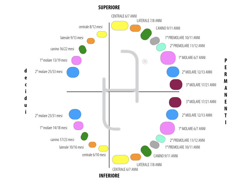 Puoi così controllare quali sono i tempi medi di eruzione dei denti da latte e dei permanenti. Ma ricorda: il mondo è bello perché vario quindi variazioni individuali sono assolutamente normali!